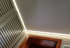 • Возможность создания разного типа освещения – подвесного настенного, встроенного, установки светодиодных лент и прочих видов. Натяжные потолки, если они смонтированы гарпунным методом, можно в любое время демонтировать и установить на новое место, если размер новой ванной будет соответствовать размерам полотнища.